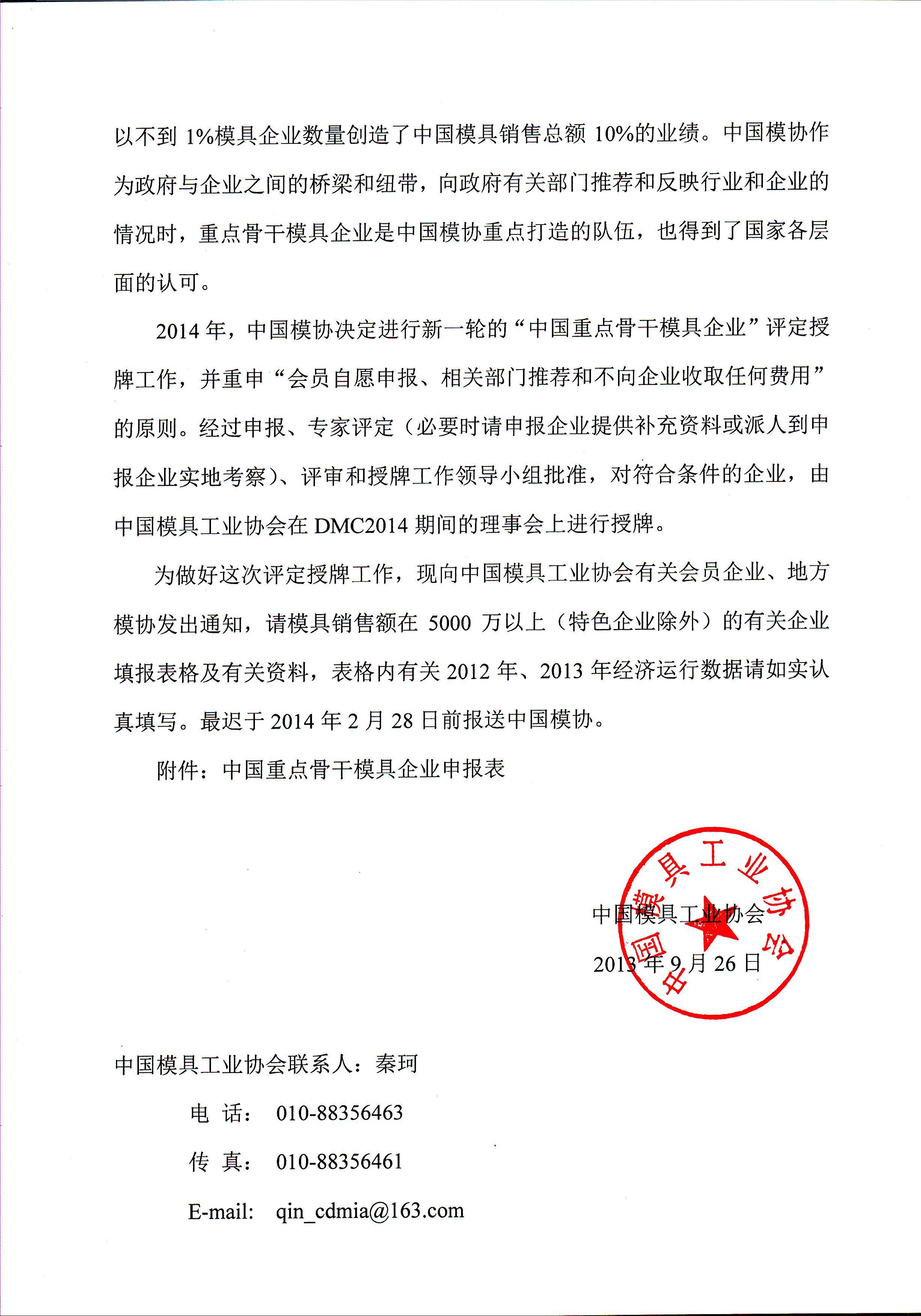 關于開展2014年“中國重點骨干模具企業”評定工作的通知