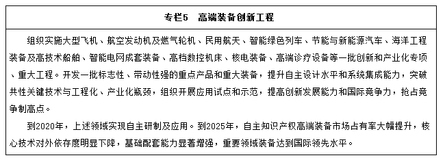 航空裝備。加快大型飛機研制,適時啟動寬體客機研制,鼓勵國際合作研制重型直升機;推進干支線飛機、直升機、無人機和通用飛機產業化。突破高推重比、先進渦槳(軸)發動機及大涵道比渦扇發動機技術,建立發動機自主發展工業體系。開發先進機載設備及系統,形成自主完整的航空產業鏈。