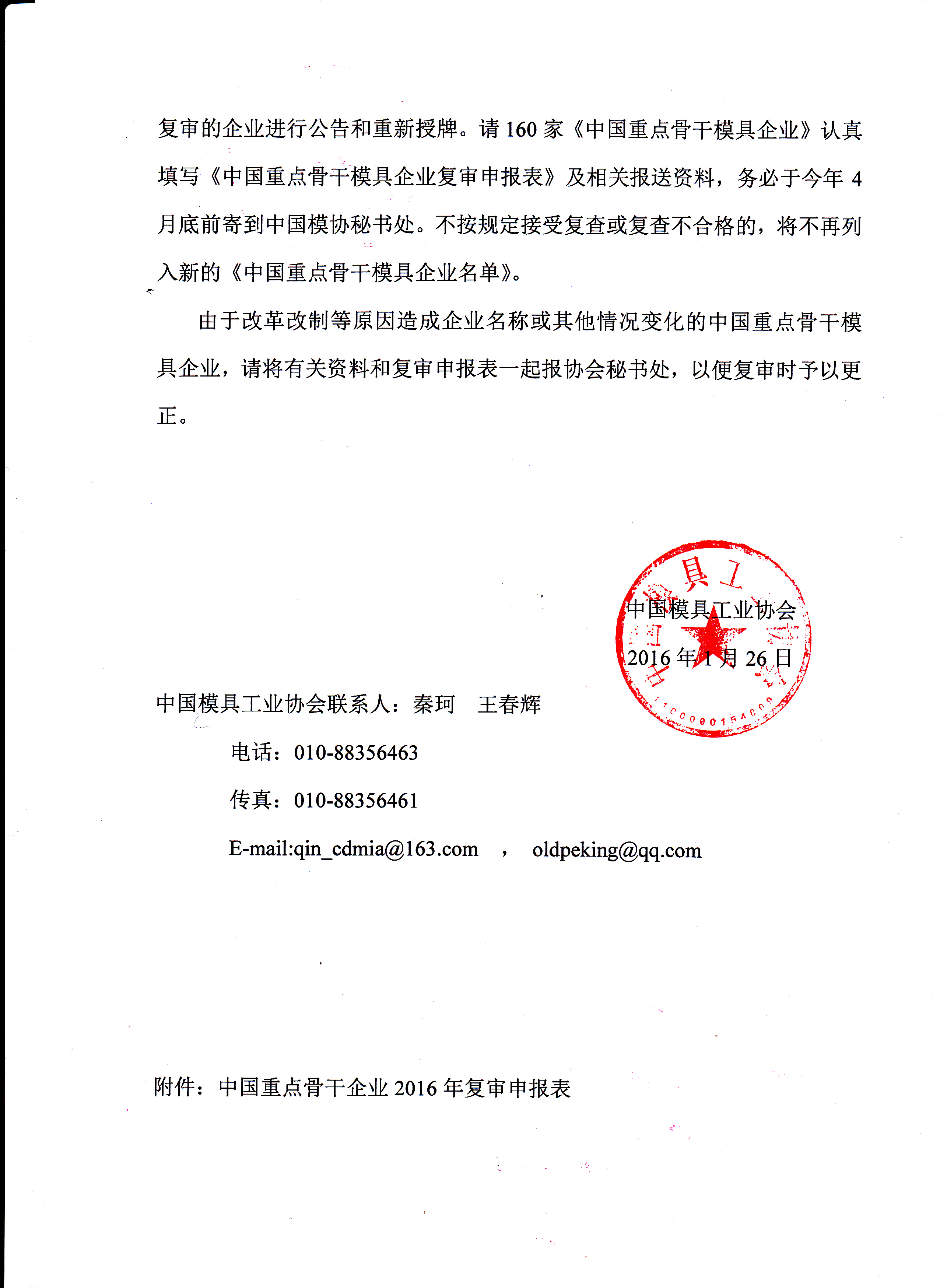 關(guān)于開展2016年“中國重點骨干模具企業(yè)”復(fù)審工作的通知