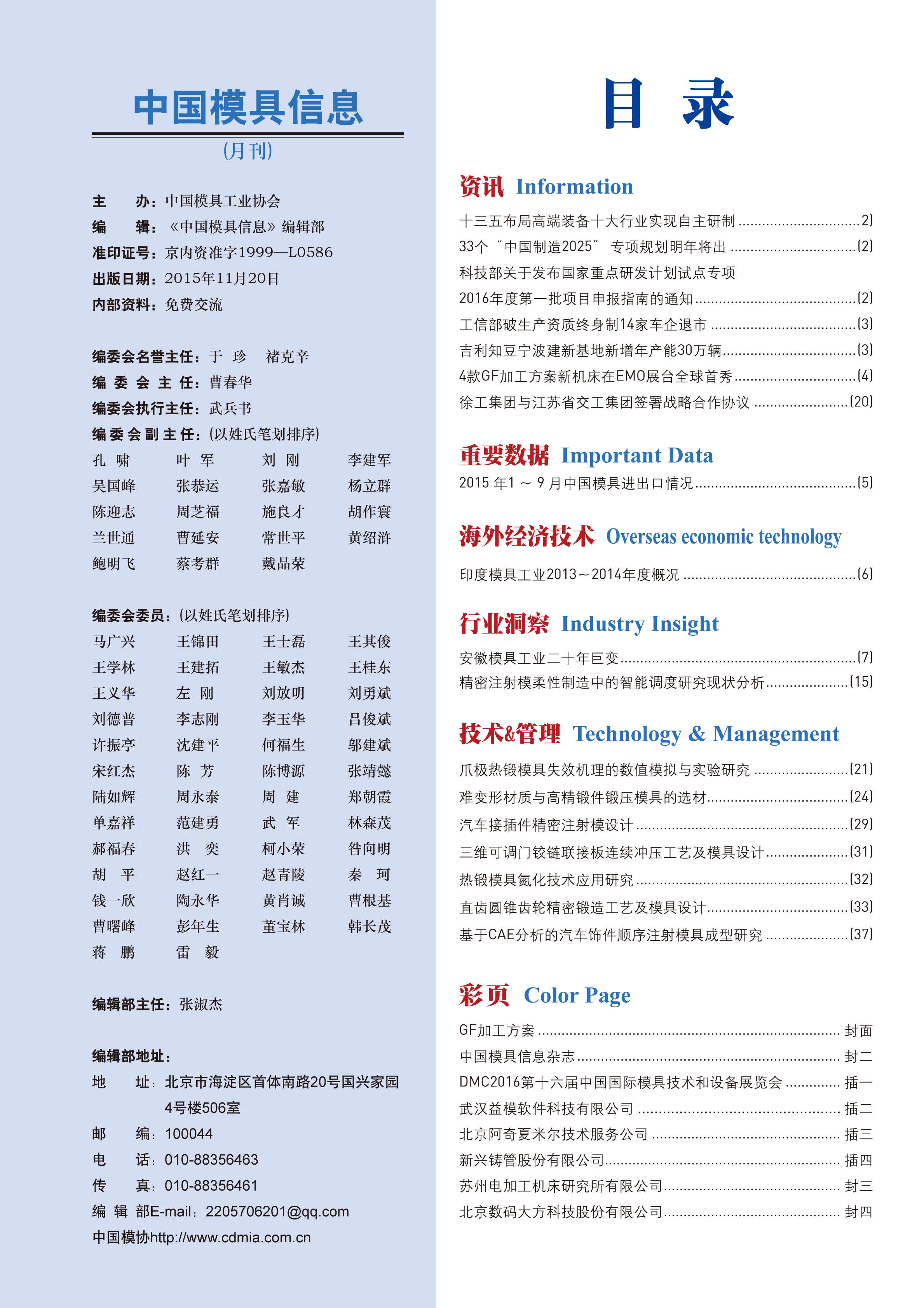 中國模具信息2015年第十一期目錄