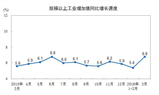 2016年3月份,規(guī)模以上工業(yè)增加值同比實(shí)際增長6.8%(以下增加值增速均為扣除價格因素的實(shí)際增長率),比1-2月份加快1.4個百分點(diǎn)。從環(huán)比看,3月份,規(guī)模以上工業(yè)增加值比上月增長0.64%。一季度,規(guī)模以上工業(yè)增加值同比增長5.8%。