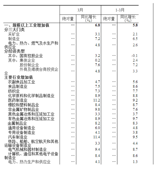 分經(jīng)濟(jì)類型看,3月份,國有控股企業(yè)增加值同比增長3.2%;集體企業(yè)增長0.2%,股份制企業(yè)增長7.6%,外商及港澳臺商投資企業(yè)增長4.8%。
