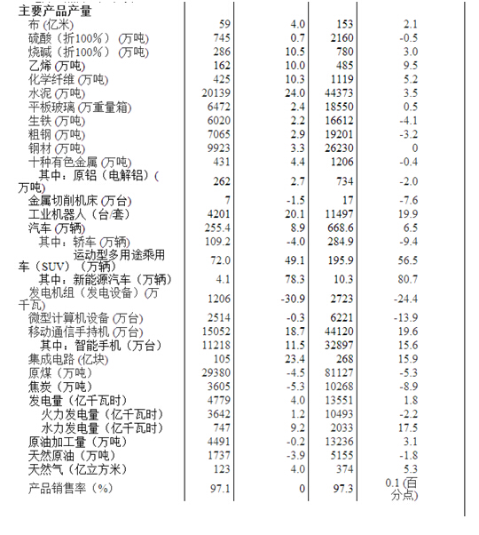 分產(chǎn)品看,3月份,588種產(chǎn)品中有412種產(chǎn)品同比增長。其中,鋼材9923萬噸,同比增長3.3%;水泥20139萬噸,增長 24.0%;十種有色金屬431萬噸,增長4.4%;乙烯162萬噸,增長10.0%;汽車255.4萬輛,增長8.9%;轎車109.2萬輛,下降4.0%;發(fā)電量4779億千瓦時,增長4.0%;原油加工量4491萬噸,下降0.2%。