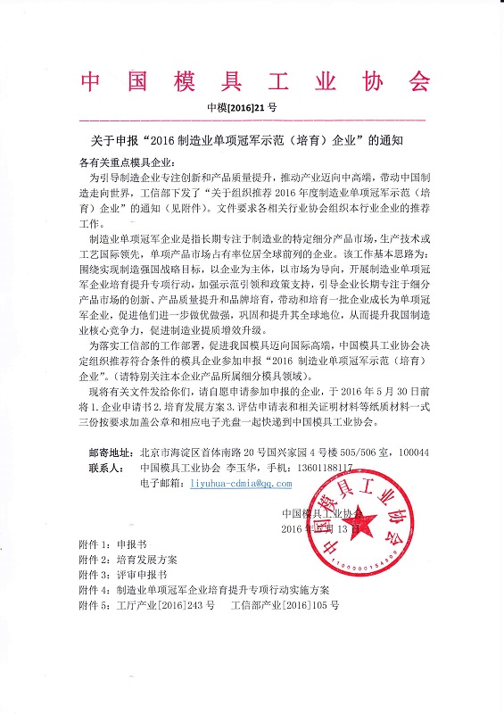 關于申報“2016制造業單項冠軍示范(培育)企業”的通知