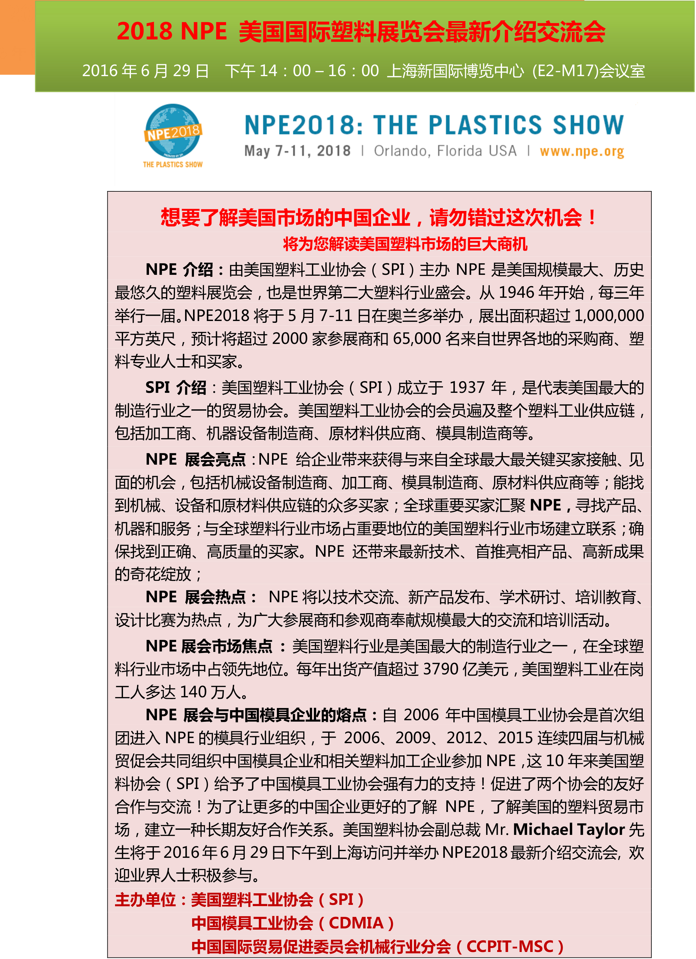 2018NPE 美國國際塑料展覽會最新介紹交流會