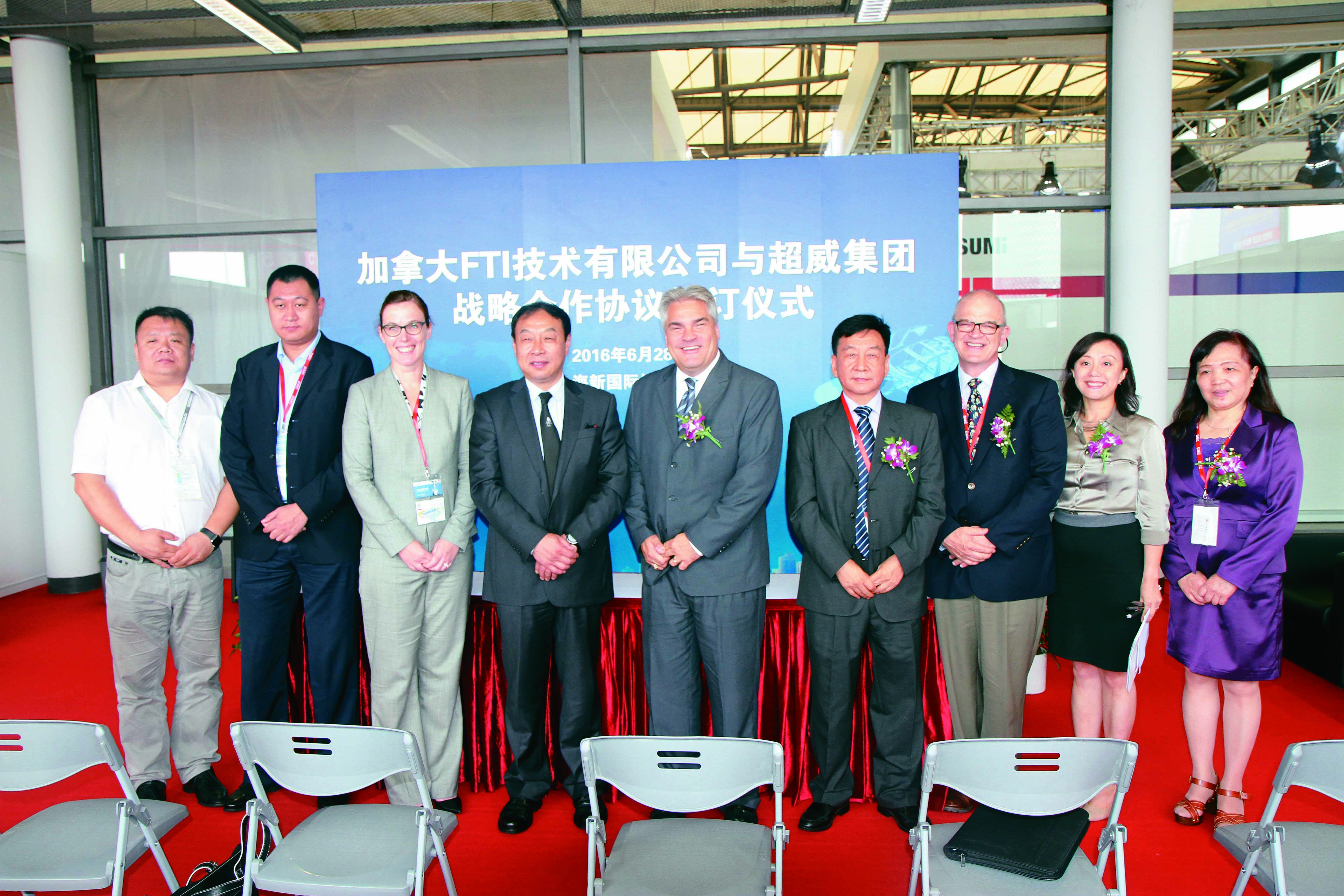 2016 年6 月28 日,DMC2016 展會拉開了序幕,在此次展會上加拿大F T I 技術(shù)有限公司與超威集團(tuán)簽訂戰(zhàn)略合作協(xié)議,中國模具工業(yè)協(xié)會常務(wù)副會長兼秘書長武兵書先生、中國模具工業(yè)協(xié)會副秘書長李玉華女生、浙江普朗特電動汽車有限公司C EO 王國富先生、加拿大F T I 技術(shù)有限公司CEO Michael Gallagher 先生、加拿大駐上海領(lǐng)事兼商務(wù)專員Katrin Spence 女士出席了本次簽約儀式。