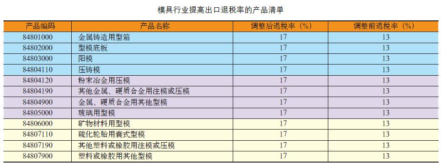 動機、汽油、航空煤油、柴油等產品的出口退稅率提高至17%,并自2016 年11 月1 日起執行。本通知所附《提高出口退稅率的產品清單》中,模具行業提高出口退稅率的產品清單具體如下表所示: