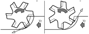 在高效切削加工中,應盡量選用順銑加工,因為在順銑時,刀具剛切入工件產生的切屑厚度為最大,隨后逐漸減小。在逆銑時,刀具剛切入工件產生的切屑厚度為最小,隨后逐漸增厚,這樣增加了刀具與工件的摩擦,在刀刃上產生大量熱,所以在逆銑中產生的熱量比在順銑時多很多,徑向力也大大增加,緩解了高硬度切削時切削熱對刀具的損傷。同時在逆銑中刀刃受力狀態較順銑更為惡劣,降低了刀片的使用壽命,順銑和逆銑時刀具切入工件的過程,如圖(二)所示。
