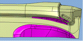 原工藝采用拉延出一部分形狀后序整形的方法,整形量較大達到近8mm。在保證B處在拉延不開裂的情況下,此臺階盡量拉延到位,使整形量相對減少到3.5mm左右,整形時疊料缺陷消除。整改前后數模對比如下圖: