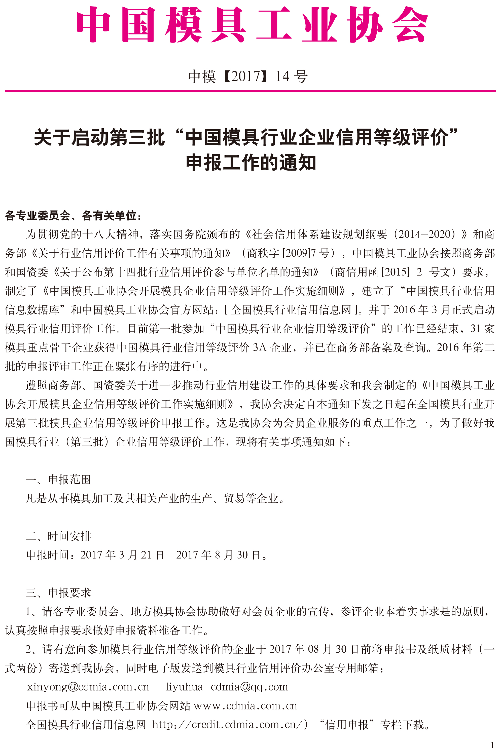 關(guān)于啟動(dòng)第三批“中國(guó)模具行業(yè)企業(yè)信用等級(jí)評(píng)價(jià)”申報(bào)工作的通知