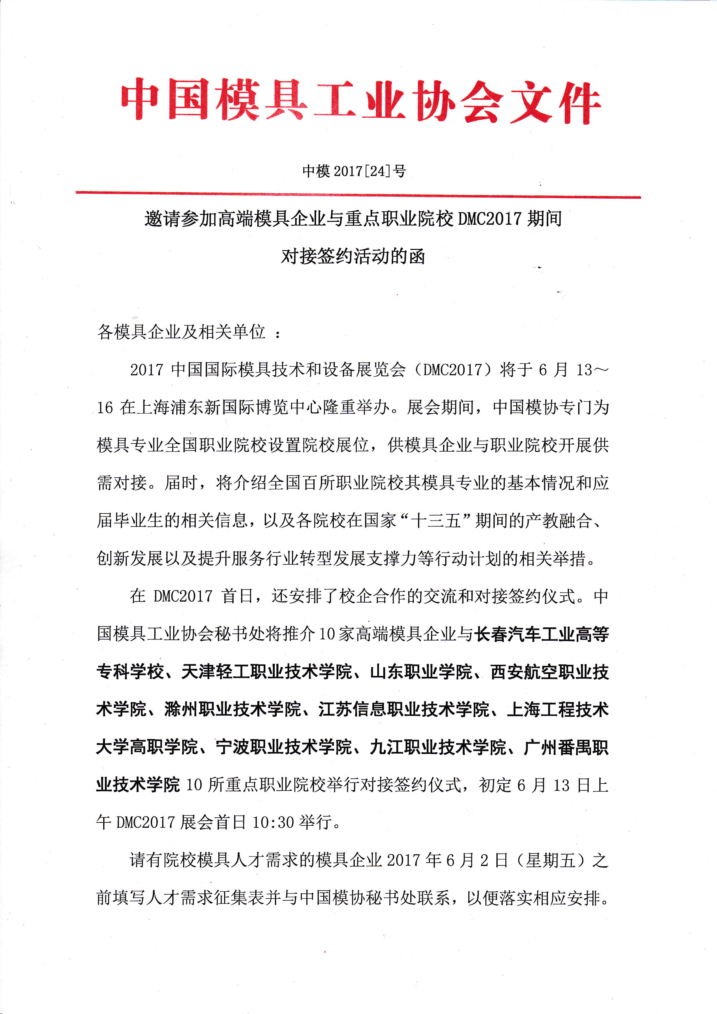 邀請參加高端模具企業與重點職業院校DMC2017期間對接簽約活動的函