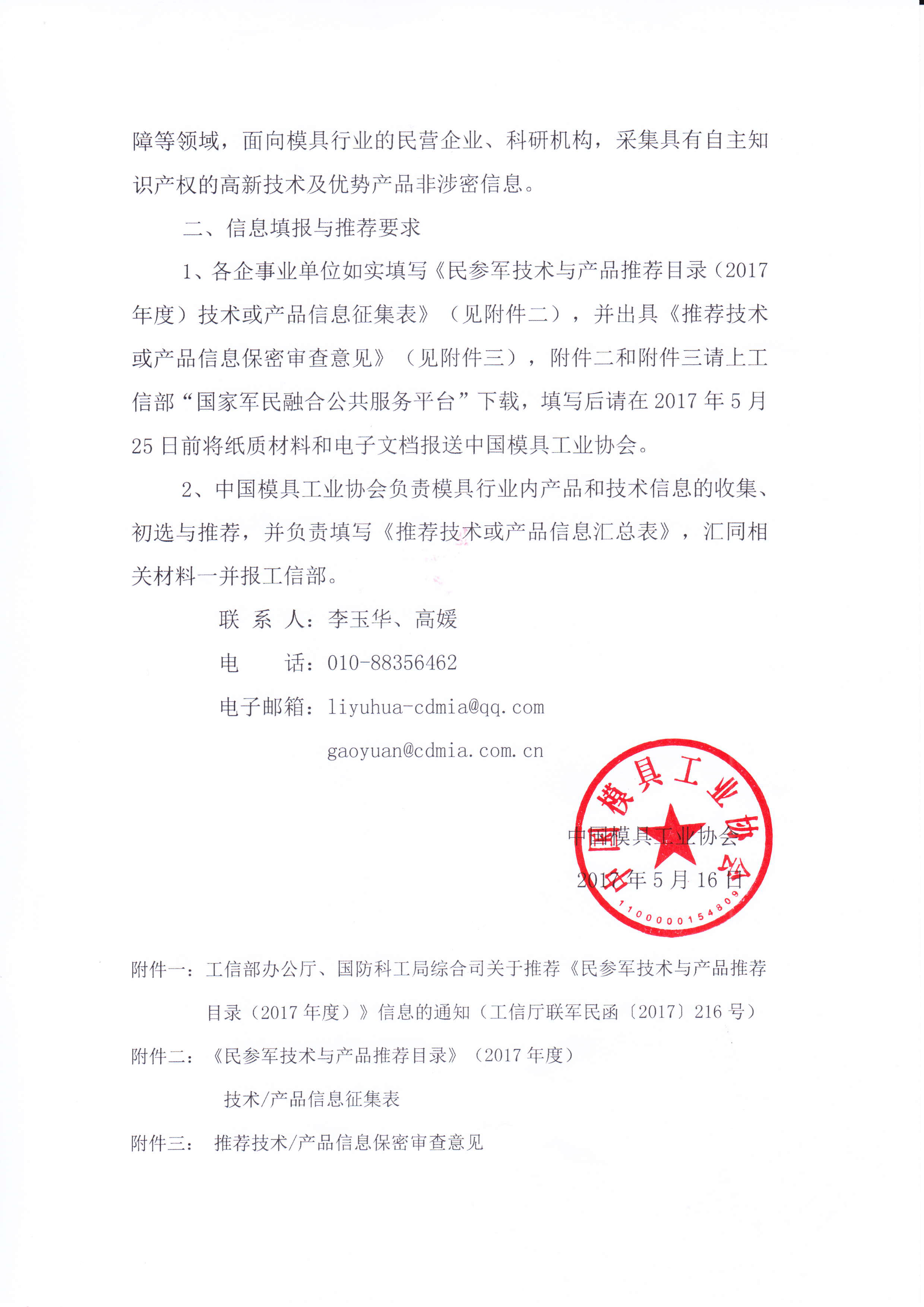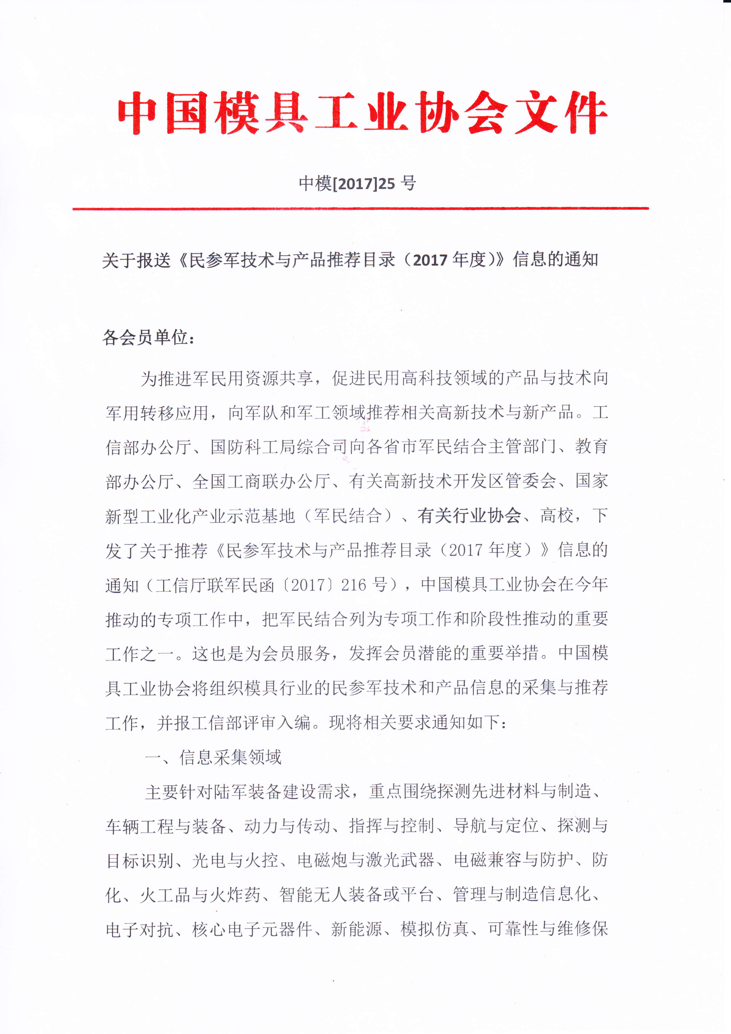 關于報送《民參軍技術與產品推薦目錄(2017年度)》信息的通知