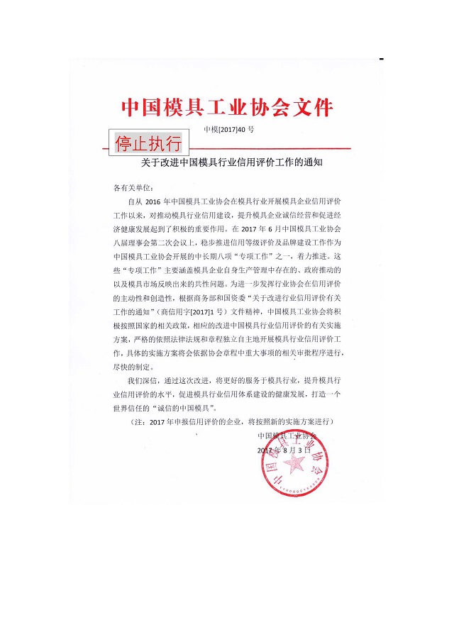 關(guān)于改進(jìn)中國模具行業(yè)信用評價工作的通知