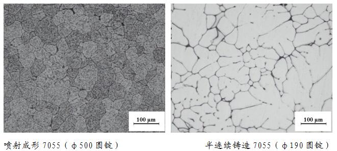噴射成形技術可大幅度提升凝固過程中的冷卻速率,采用該技術制備的合金晶粒為細小等軸晶,微觀組織均勻,無宏觀偏析。噴射成形7055鋁合金與半連續鑄造7055鋁合金的金相對比見圖2。