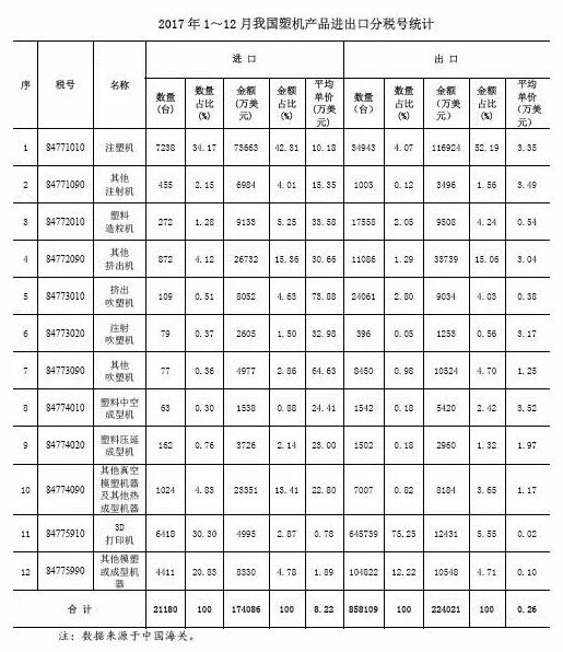 2017年中國塑機產(chǎn)品進出口分稅號統(tǒng)計數(shù)據(jù)。