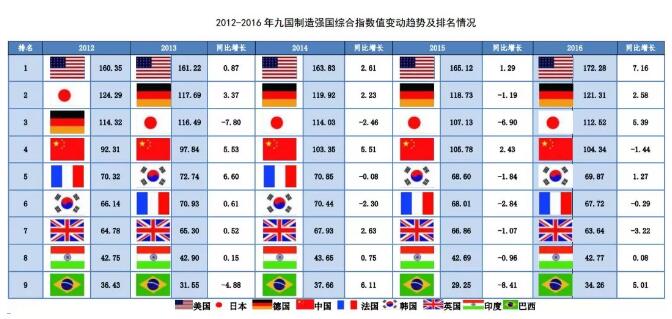2、2012—2016年中國指數值增長最大,符合制造強國戰略預期。