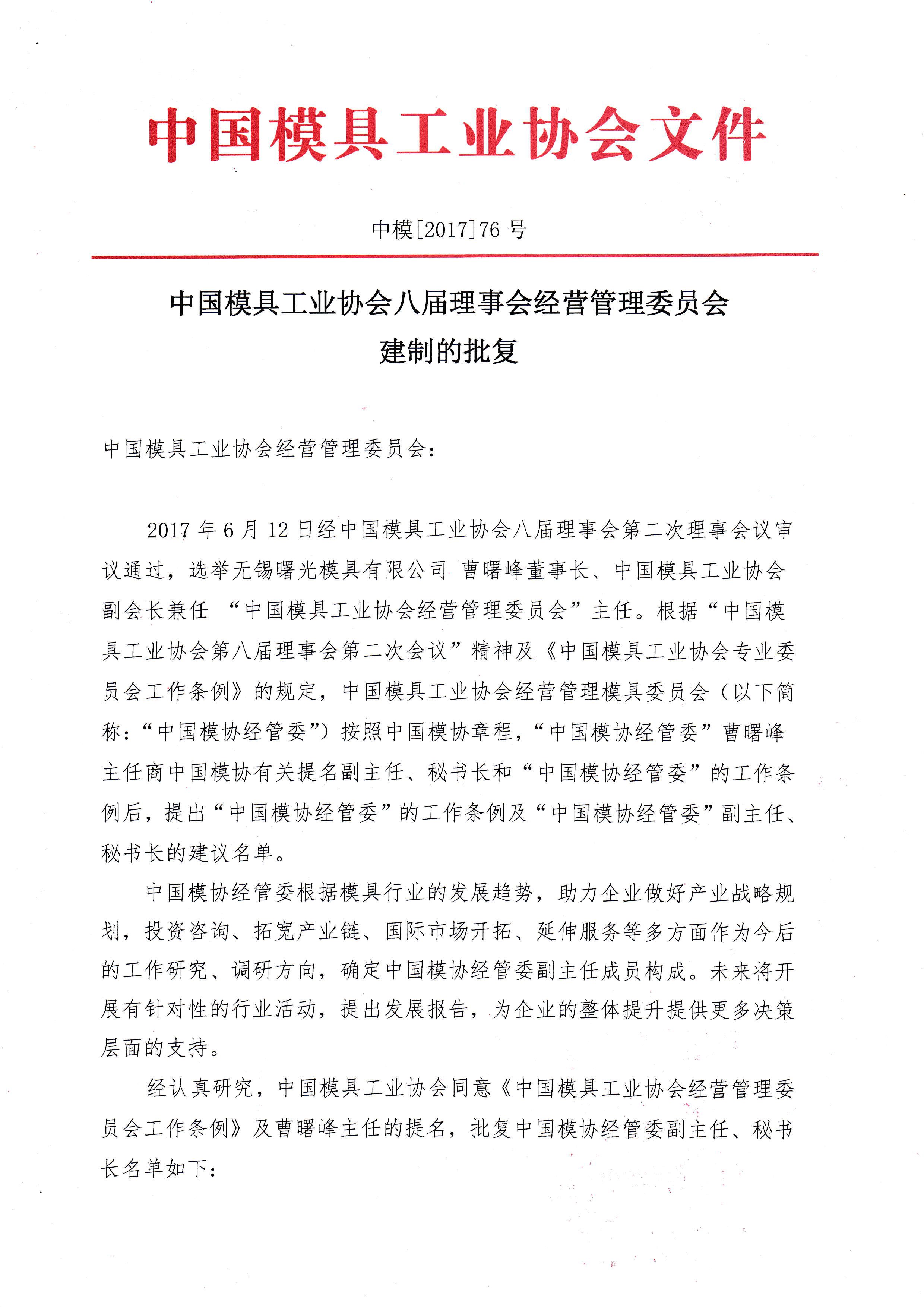 中國模具工業協會八屆理事會經營管理委員會建制的批復
