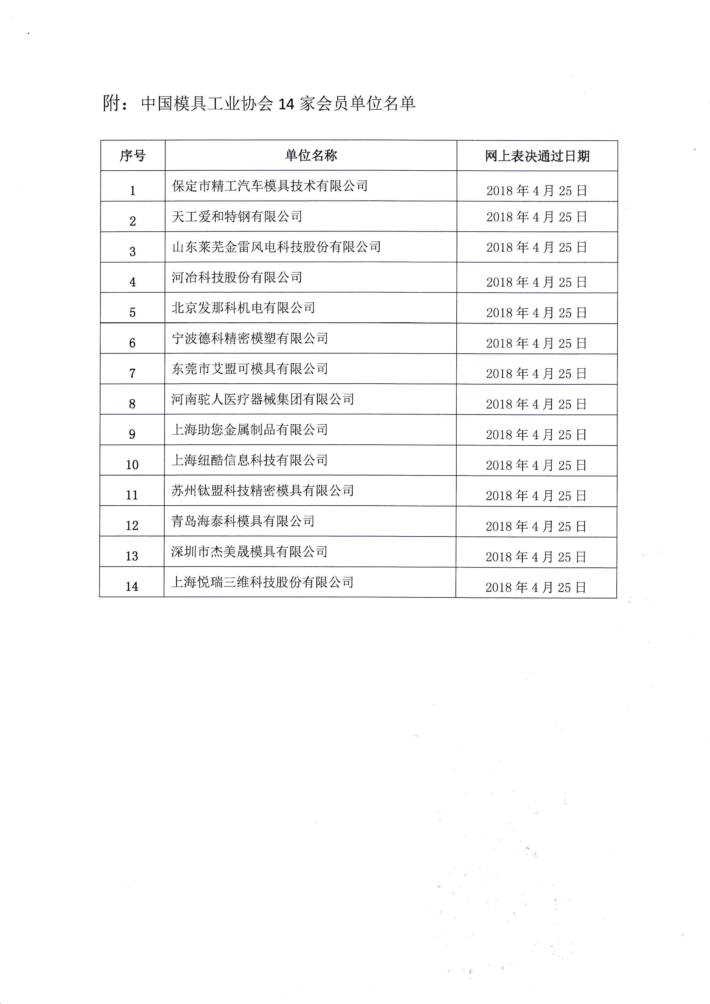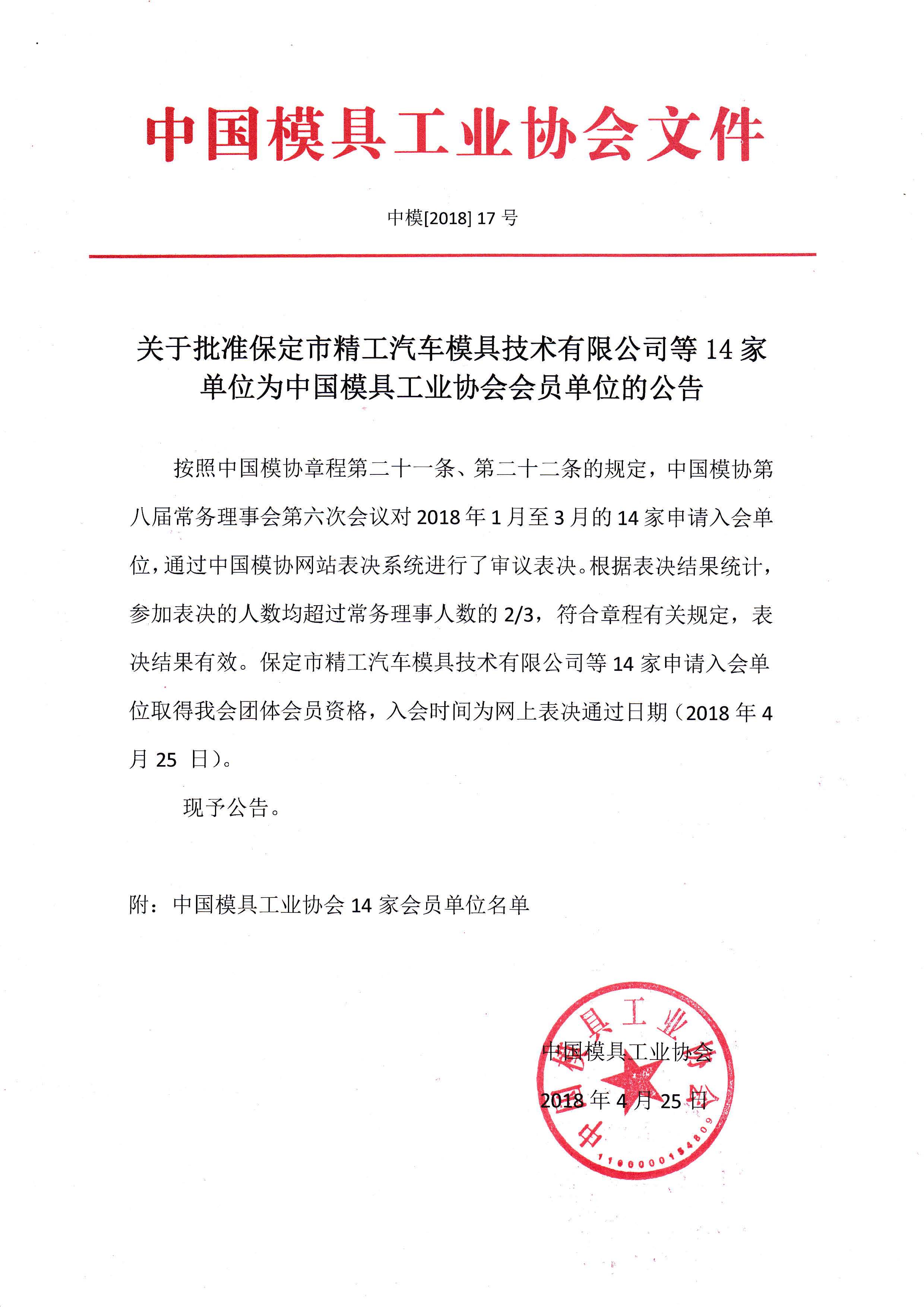 關(guān)于批準(zhǔn)保定市精工汽車模具技術(shù)有限公司等14家單位為中國模具工業(yè)協(xié)會會員單位的公告