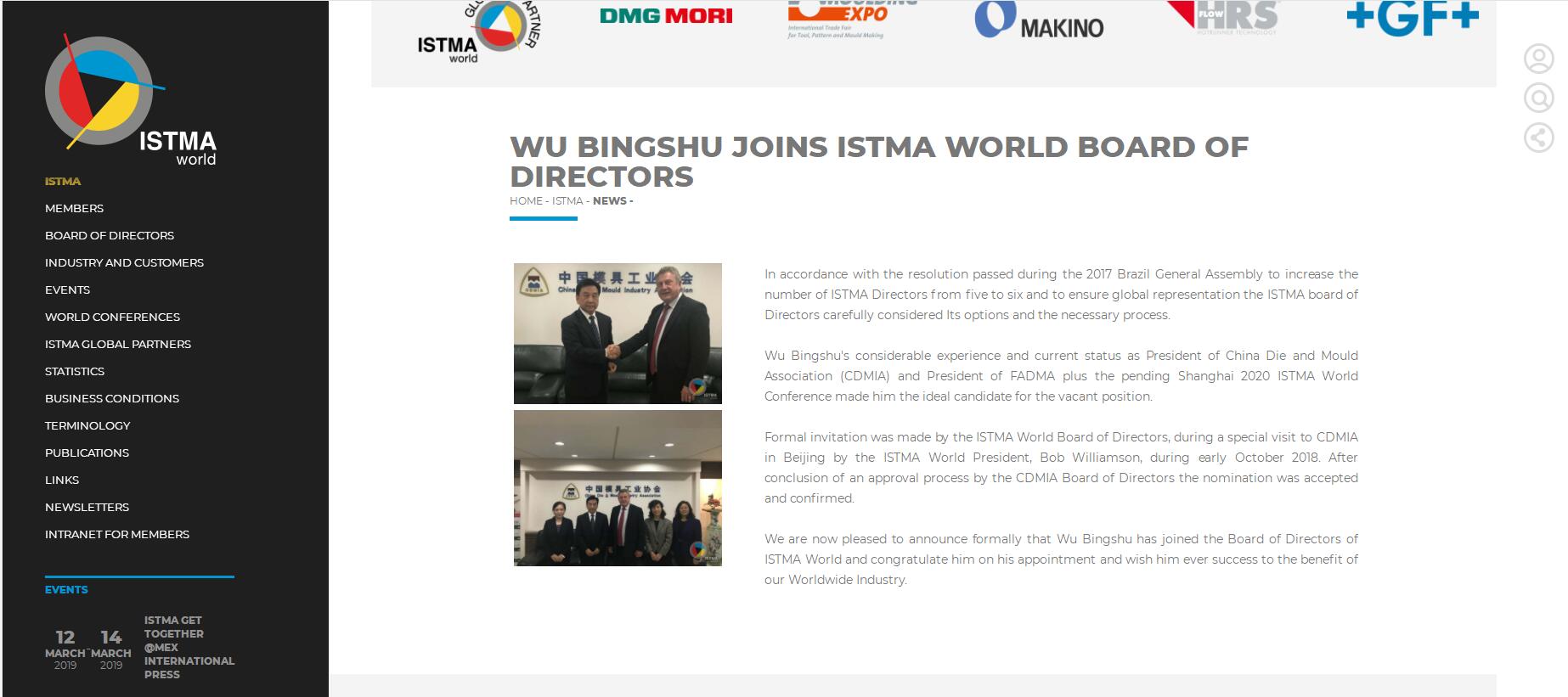 國際專用工裝和加工協(xié)會主席Bob Williamson于2018年 9月18日郵件正式致函中國模具工業(yè)協(xié)會,經(jīng)他提名中國模具工業(yè)協(xié)會會長武兵書先生擔(dān)任國際模協(xié)ISTMA董事(ISTMA World Director)。