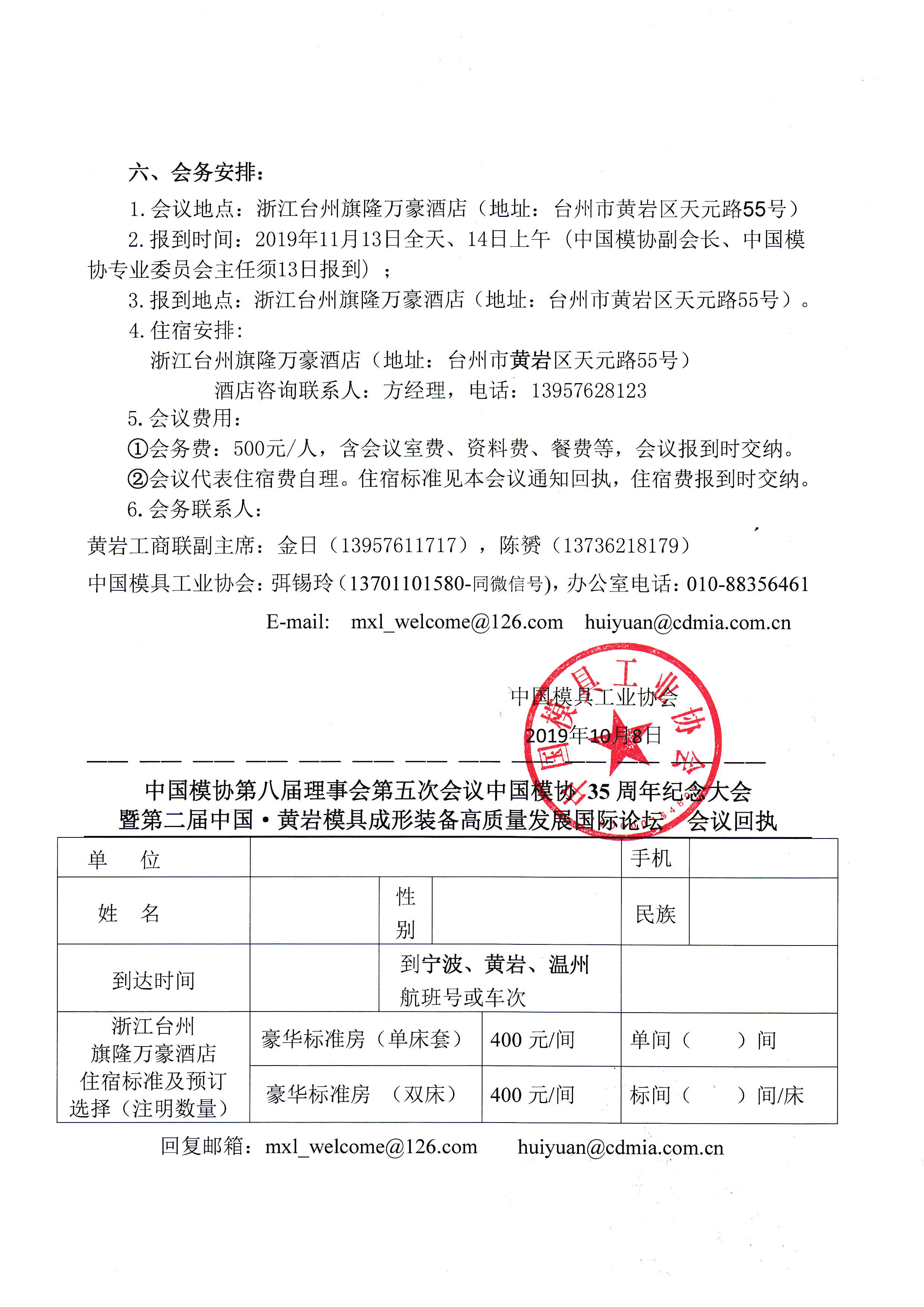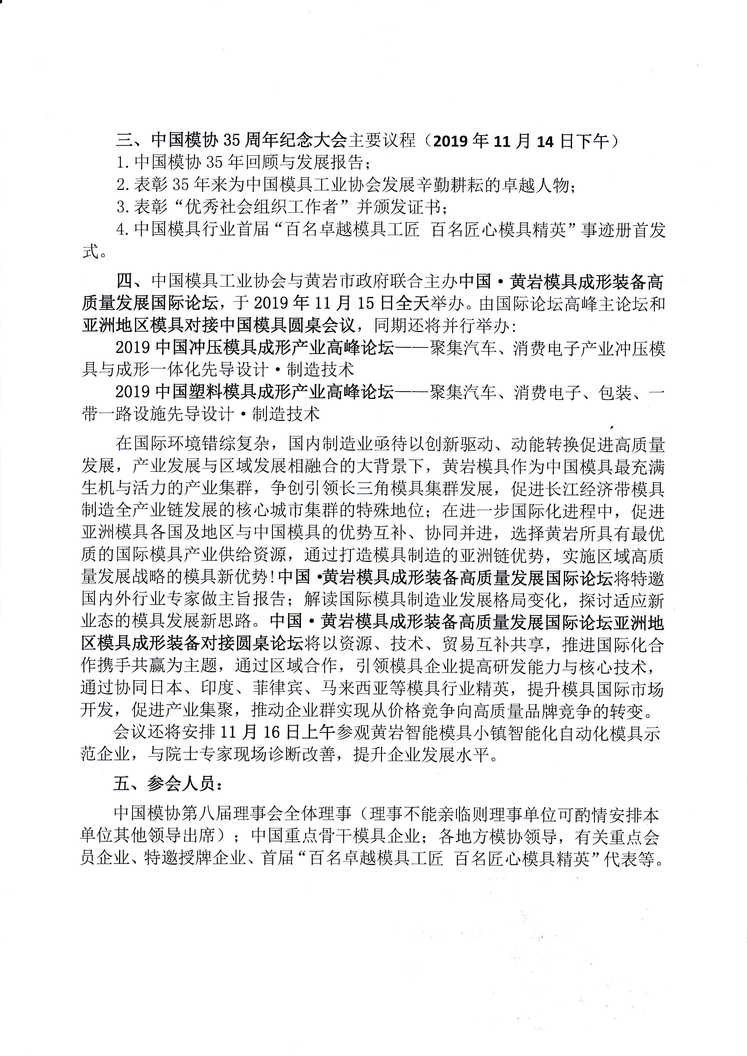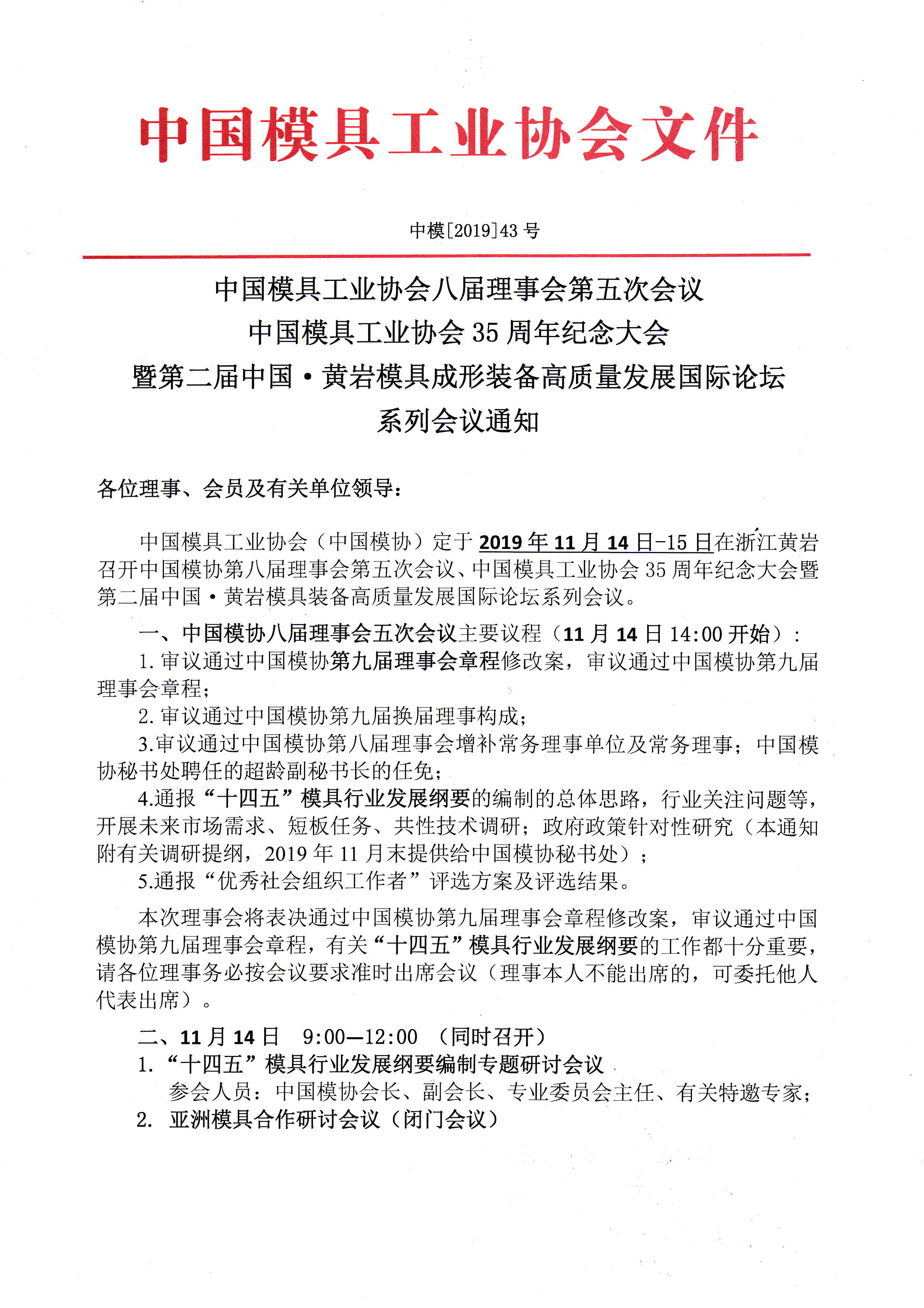 中國模具工業(yè)協(xié)會八屆理事會第五次會議 中國模具工業(yè)協(xié)會35周年紀(jì)念大會暨第二屆中國黃巖模具裝備高質(zhì)量發(fā)展國際論壇系列會議通知