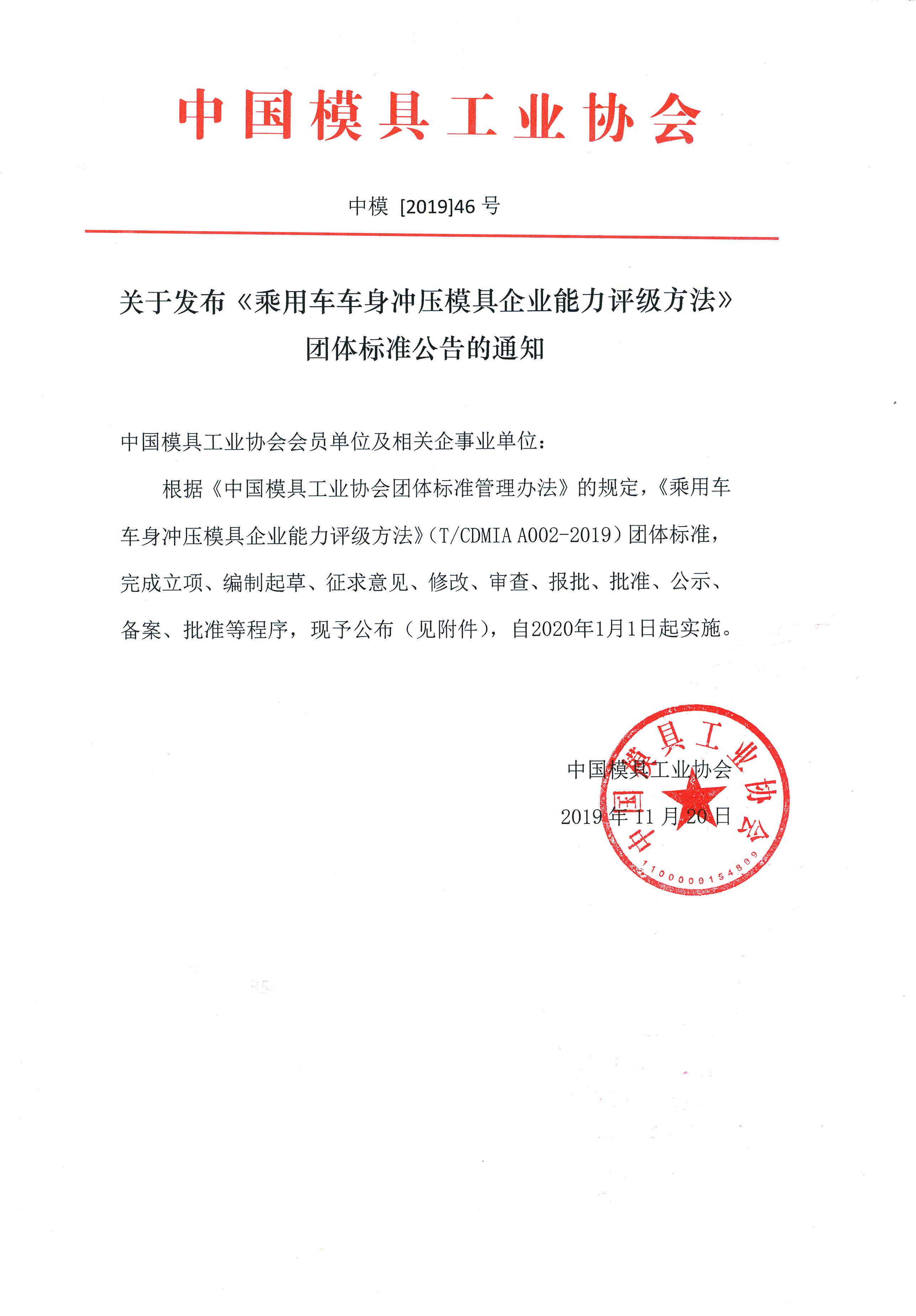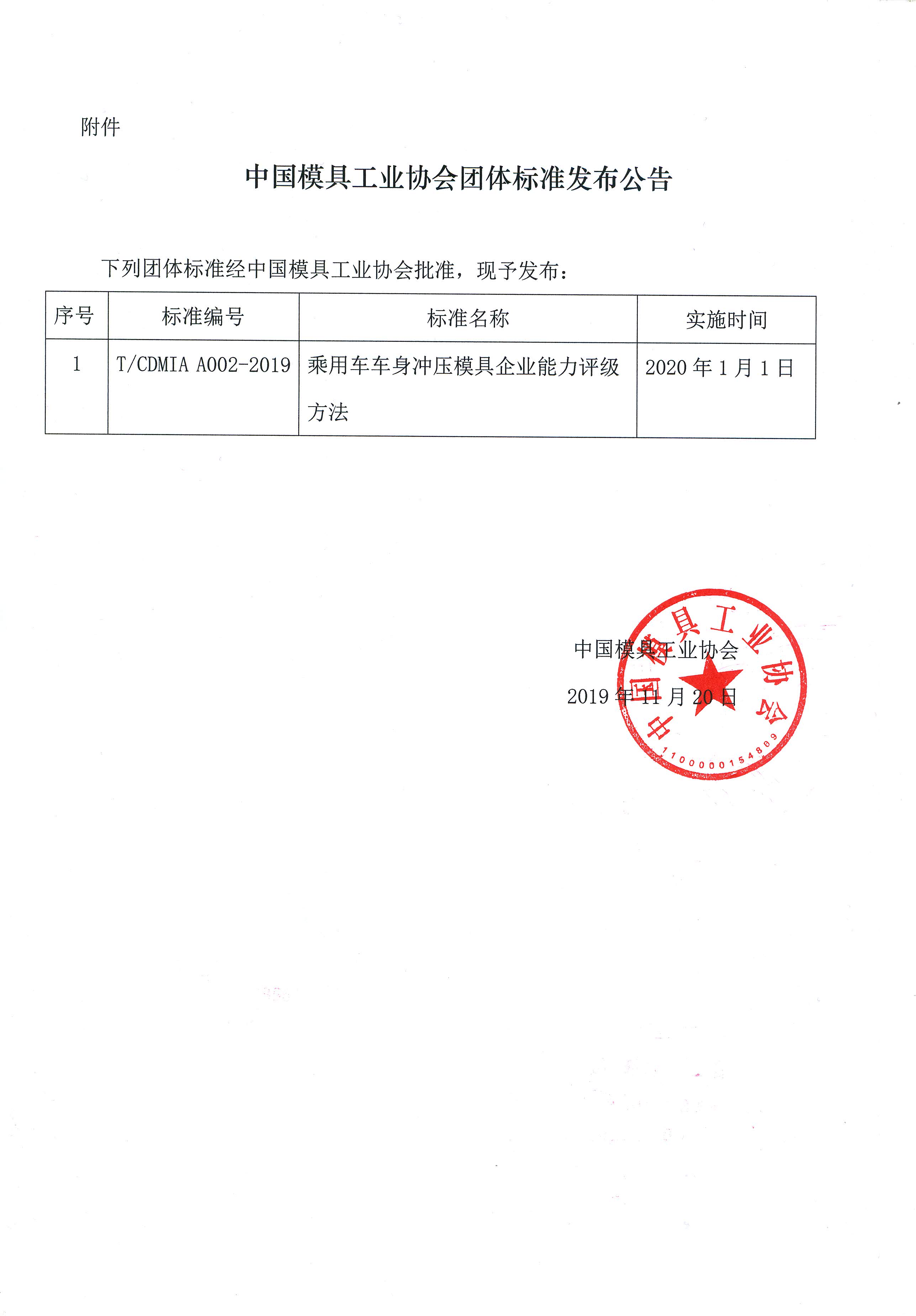 關(guān)于發(fā)布《乘用車(chē)車(chē)身沖壓模具企業(yè)能力評(píng)級(jí)方法》團(tuán)體標(biāo)準(zhǔn)公告的通知