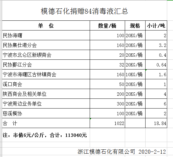 隨著新冠肺炎疫情的發(fā)展以及防控需求的不斷增大,消毒用品成為當(dāng)下最緊缺的物資之一。中國模協(xié)理事、中國模協(xié)裝備委員會副主任,寧波市陜西商會副會長、浙江模德石化有限公司總經(jīng)理趙小軍意識到此次疫情對社會的影響與自身的擔(dān)當(dāng),在當(dāng)前防疫需求緊迫和供應(yīng)困難的情況下, 2月8日迅速做出一個重要的決定,通過有效平臺向大型超市、快遞公司、倉儲物流、酒店賓館、餐飲企業(yè)、中小制造企業(yè)及公益單位無償捐贈84消毒液,在寧波海曙區(qū)民營企業(yè)協(xié)會等機(jī)構(gòu)的穿針引線下為轄區(qū)企業(yè)防疫提供盡可能的消毒產(chǎn)品供給,盡快安全復(fù)工提供幫助。
