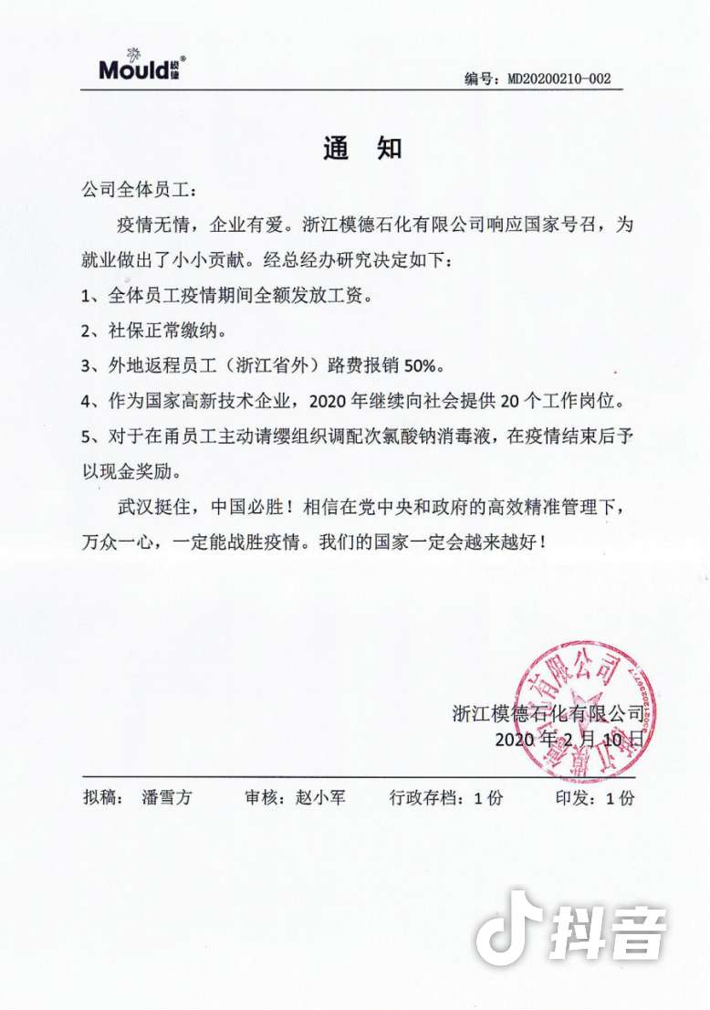 模德石化有限公司致全體職工的通知感染了我們,疫情無情,我們有愛!5條舉措實(shí)實(shí)在在為我們呈現(xiàn)了一個企業(yè)家的擔(dān)當(dāng)與責(zé)任!這樣的企業(yè)一定是一個可以信賴的長久合作企業(yè)!一定是一個支撐模具企業(yè)發(fā)展的緊密伙伴企業(yè)!
