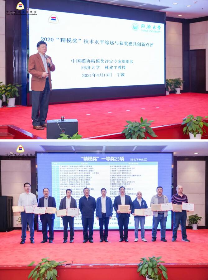 中國(guó)模協(xié)精模獎(jiǎng)評(píng)定專家組組長(zhǎng)、同濟(jì)大學(xué)林建平教授對(duì)2020“精模獎(jiǎng)”技術(shù)水平綜述與獲獎(jiǎng)模具創(chuàng)新進(jìn)行了精彩點(diǎn)評(píng)。常會(huì)長(zhǎng)、黃會(huì)長(zhǎng)為“精模獎(jiǎng)”團(tuán)隊(duì)及“優(yōu)秀供應(yīng)商”單位頒發(fā)獎(jiǎng)牌證書。