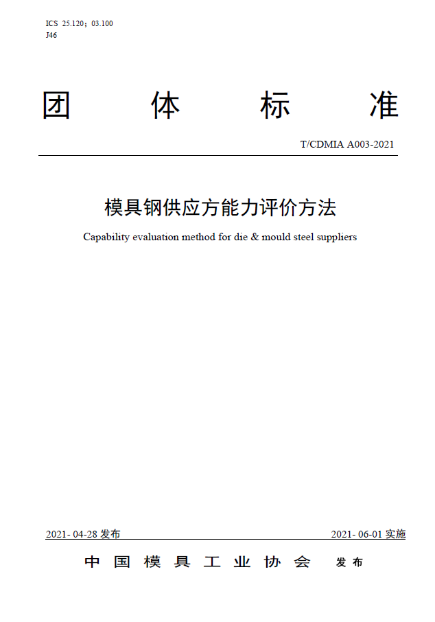中國模協(xié)標(biāo)準(zhǔn)A003-模具鋼供應(yīng)方能力評(píng)價(jià)方法-2021