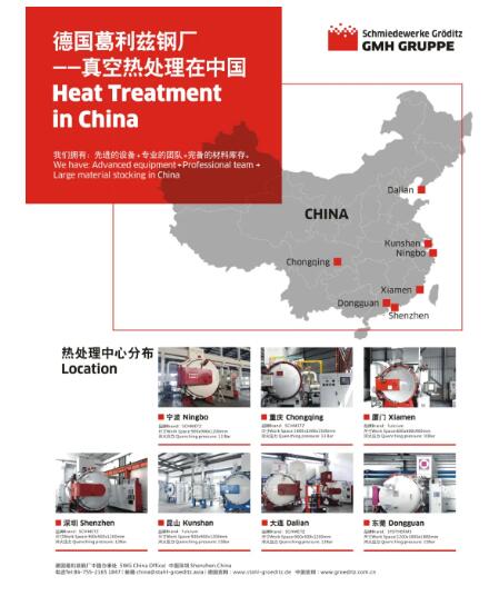 德國葛利茲鋼廠在中國模具產業集中的華南、華中及華東地區均配套有真空熱處理服務,以確保中國客戶購買到葛利茲產品的同時可以享有葛利茲熱處理的品質保證。