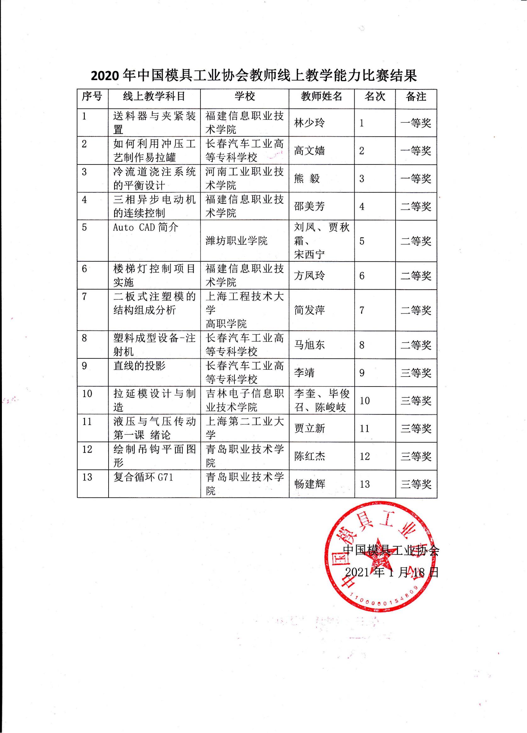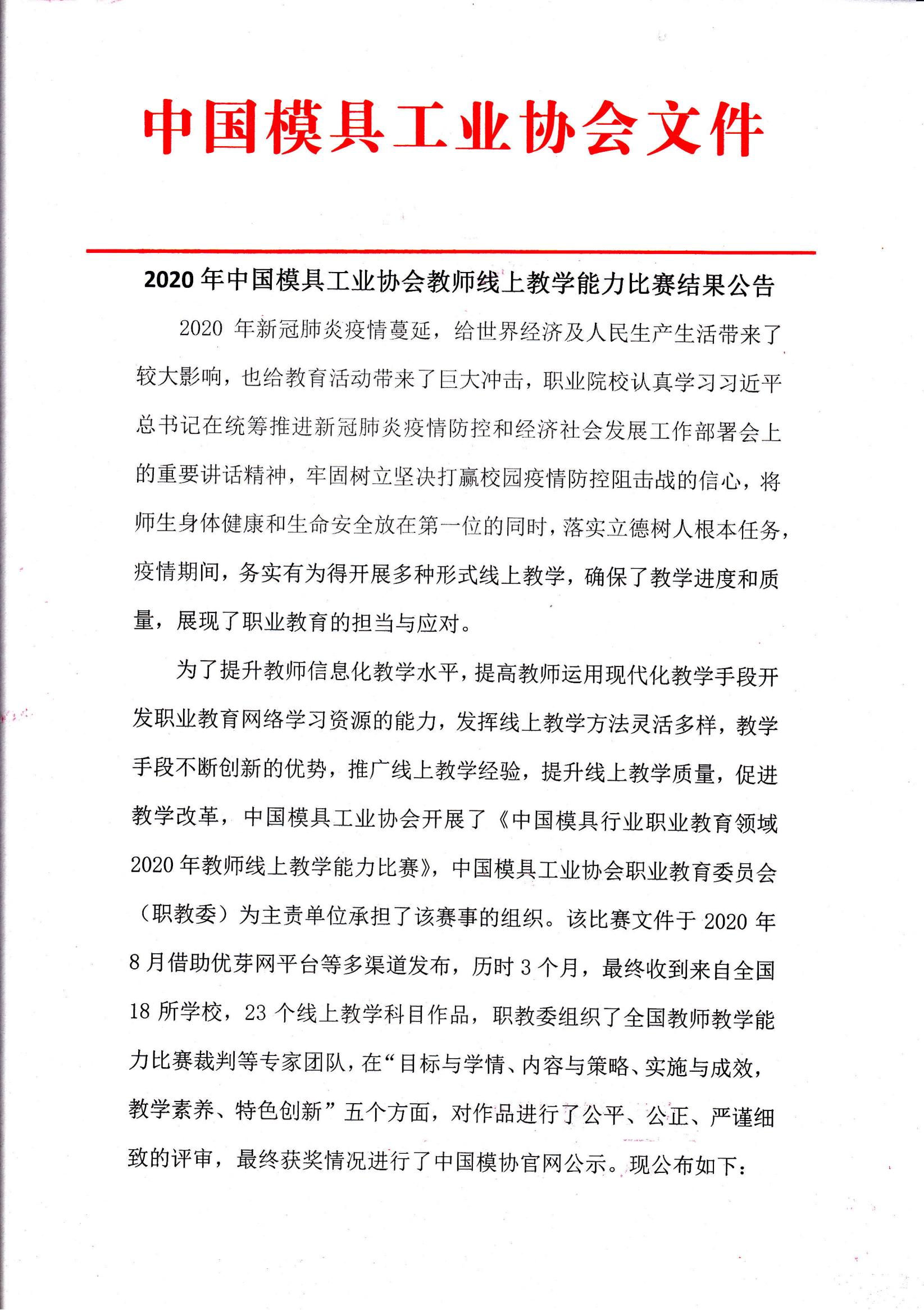 2020年中國模具工業協會教師線上教學能力比賽結果公告