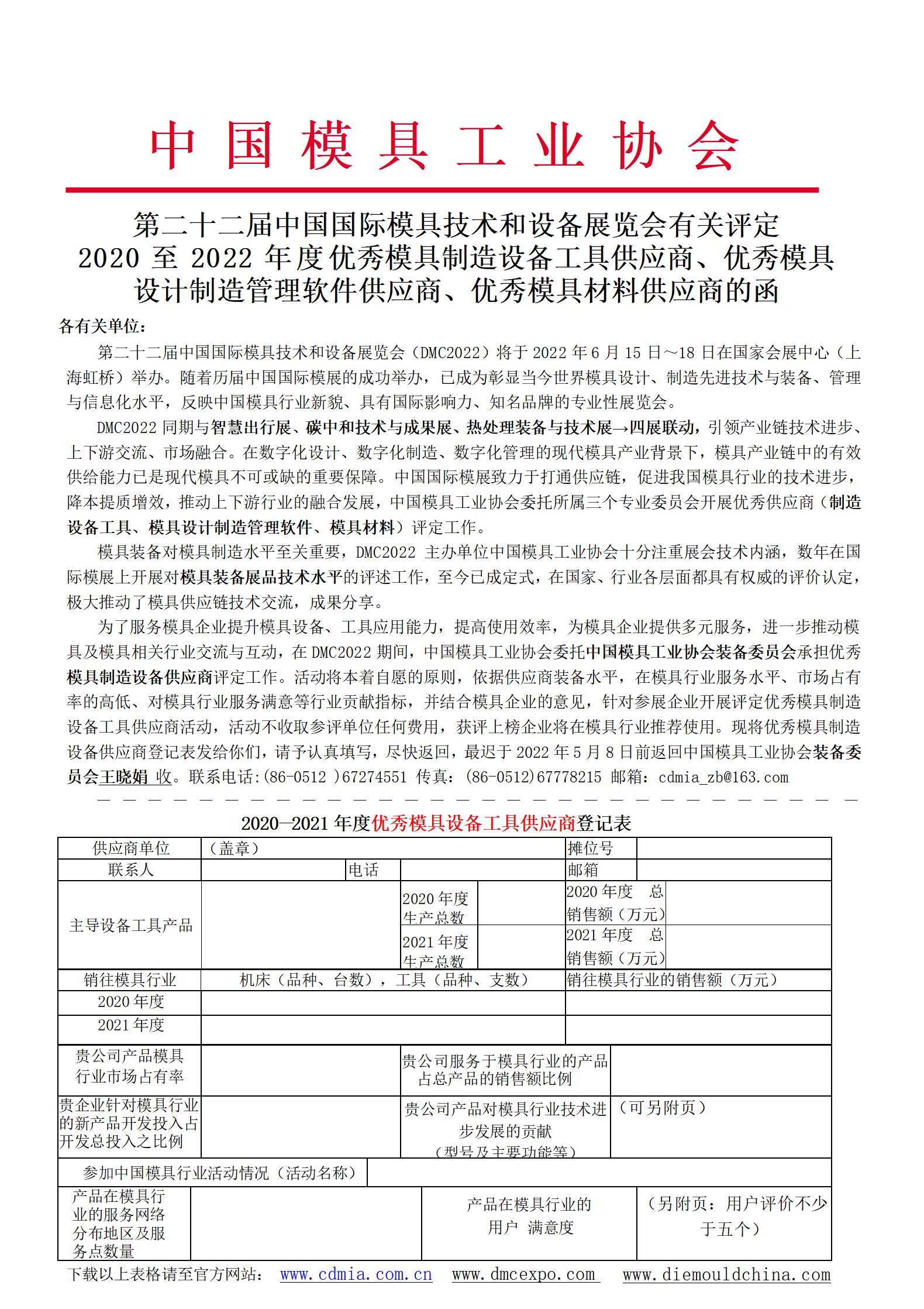 第二十二屆中國國際模具技術(shù)和設(shè)備展覽會(huì)有關(guān)評(píng)定 2020至2022年度優(yōu)秀模具制造設(shè)備工具供應(yīng)商、優(yōu)秀模具設(shè)計(jì)制造管理軟件供應(yīng)商、優(yōu)秀模具材料供應(yīng)商的函