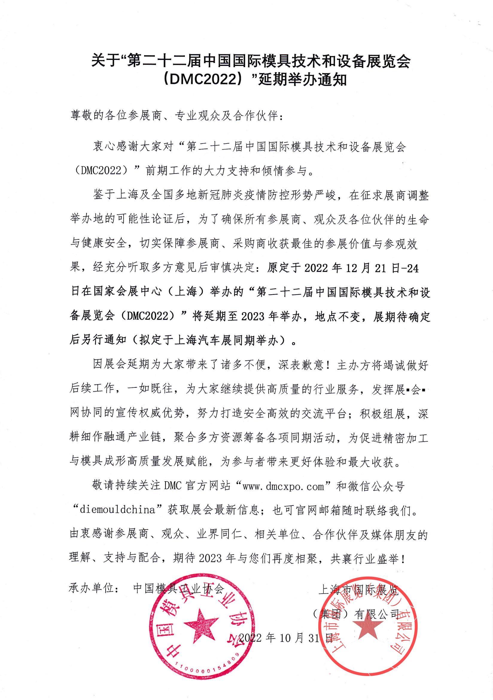 關(guān)于“第二十二屆中國(guó)國(guó)際模具技術(shù)和設(shè)備展覽會(huì)(DMC2022)”延期舉辦的通知
