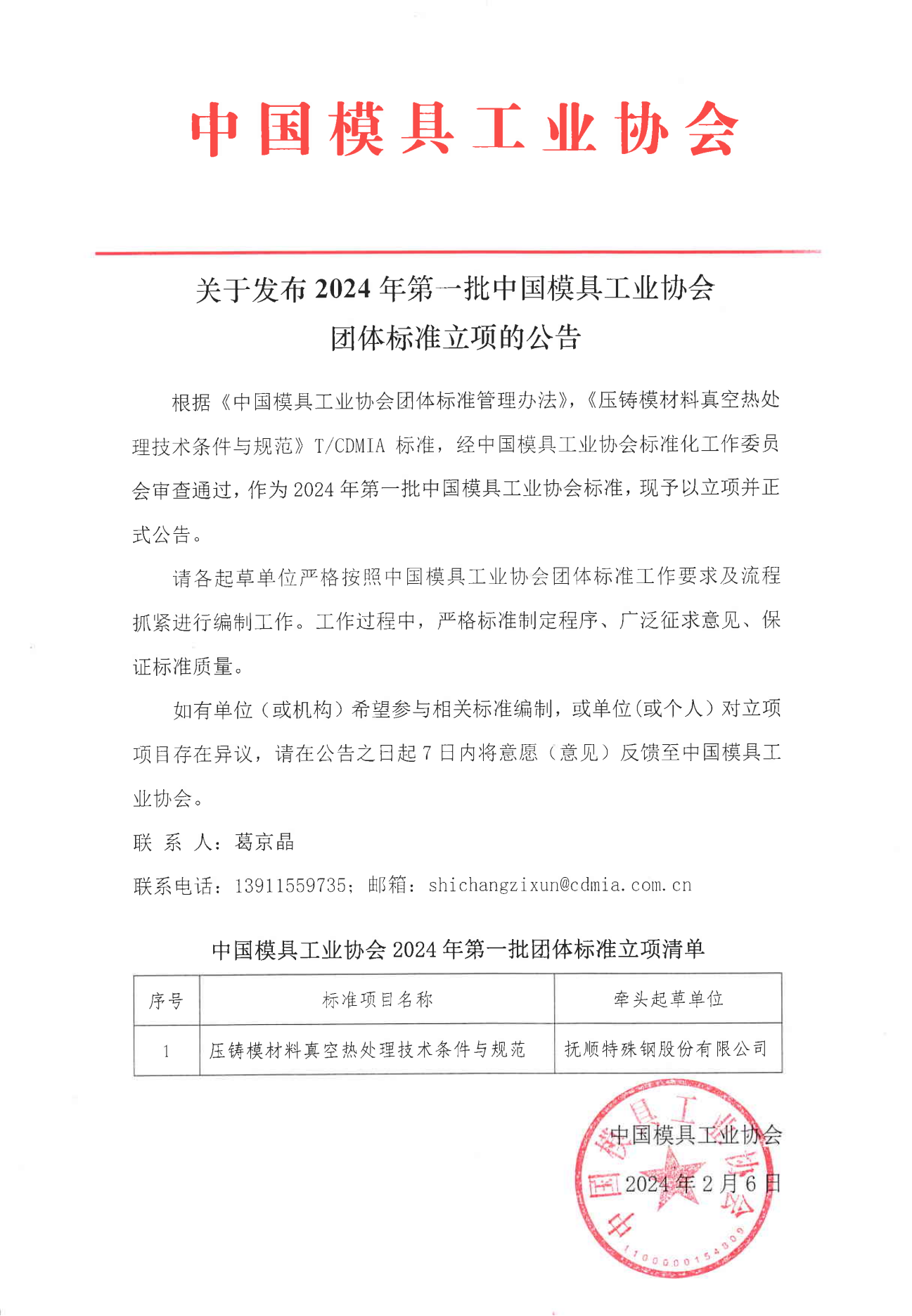 關(guān)于發(fā)布2024年第一批中國模具工業(yè)協(xié)會團體標(biāo)準(zhǔn)立項的公告