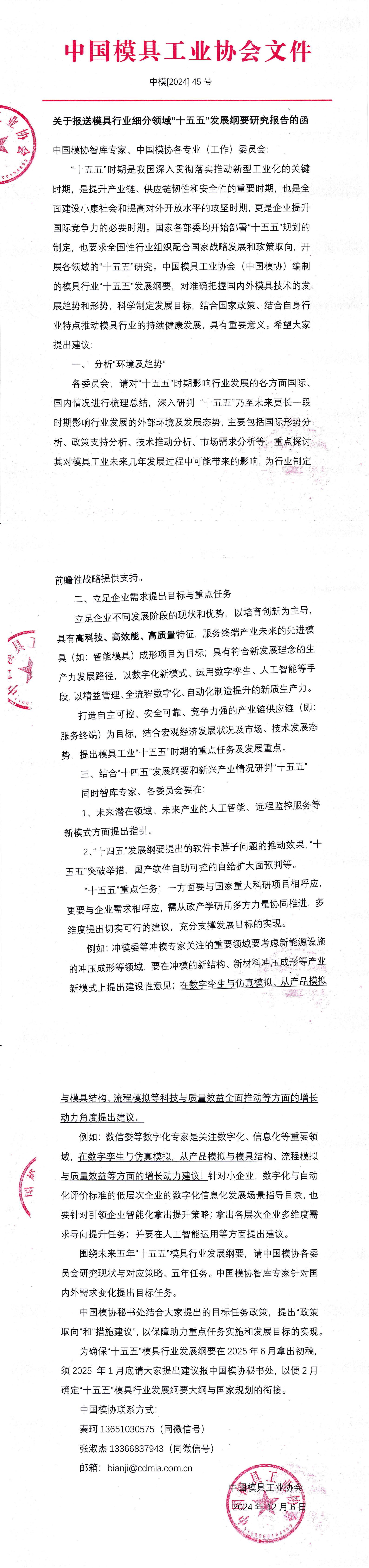 關于報送模具行業細分領域“十五五”發展綱要研究報告的函
